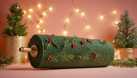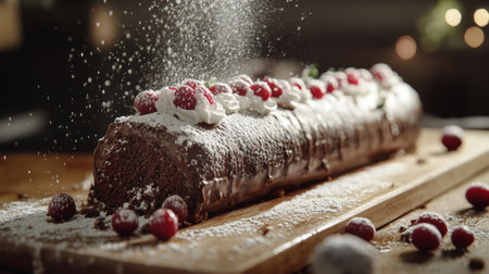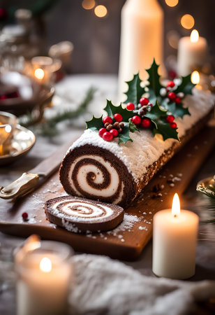 Yule log roll dessert holiday table. Berry cream decoration celebration christmas. Generate Ai