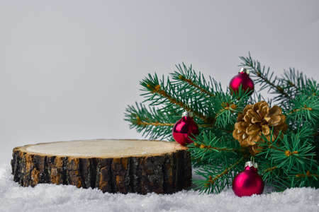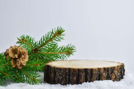 Stump in the snow for the product presentation podium.