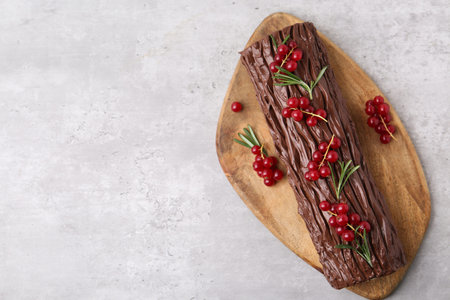 Delicious Yule log (traditional Christmas cake) with redcurrant on light table, top view. Space for text