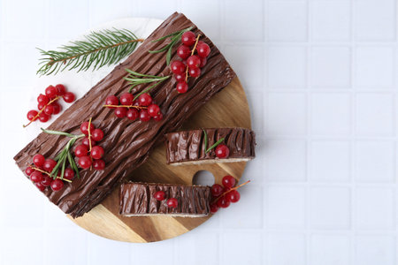 Delicious Yule log (traditional Christmas cake) with redcurrant and fir tree branch on white tiled table, top view. Space for text