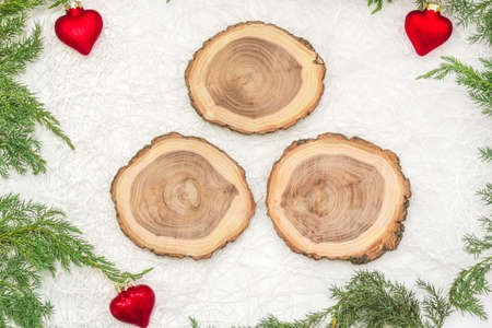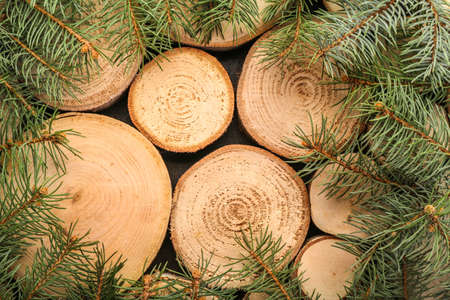 Wooden Christmas or New Year background with a frame made of natural fir tree branches and wooden slices on a rustic wooden table. Space for your text or image.Top view.