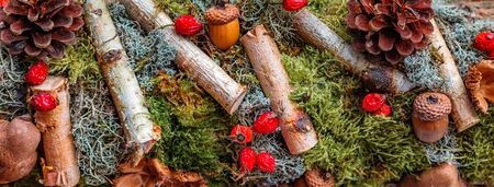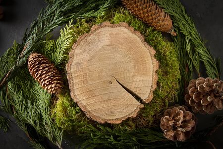 Background for text, moss, tree and cones. Dark color