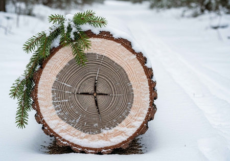 Wooden cross section of a tree with snow in the winter forest
