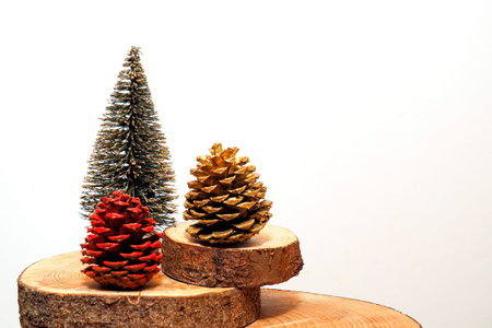 Christmas decorations, cones and background of golden light bulbs.