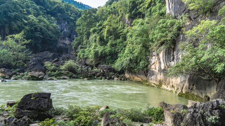 A picturesque turbulent mountain river. Boulders on the shores. There is green vegetation on the steep slopes of the coastal cliffs. China. Guiyang. Guizhou. Tianxingqiao