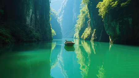 Fishing boat in the emerald water of the karst mountains