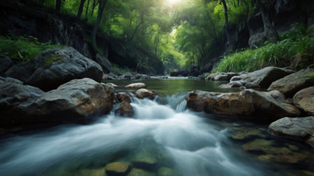 mountain river flowing through the green forest. long exposure photo.