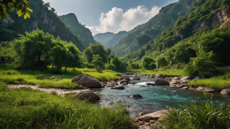 Landscape of mountain river in the morning with green grass and rocks