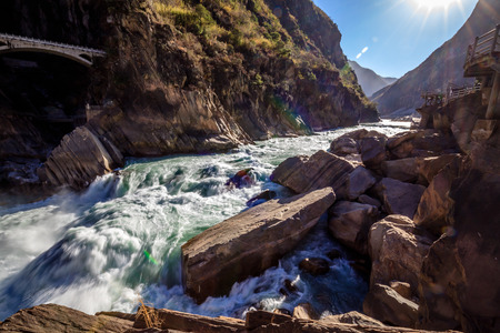 Side view of Flat tour-tourism artificial walking street that runs near the water on the right side of the river. Tiger Leaping Gorge near Lijiang Ancient Town in Yunnan, China