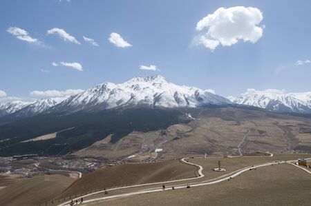 Beautiful panorama of snow capped Jade Dragon Snow Mountain. Located near Shangri - La. Tibet, China