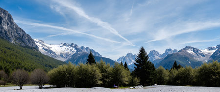 Mountain landscape with snow-capped peaks and coniferous forest