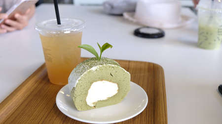 Green tea Chiffon roll on plate. Restaurant, bakery menu or recipe concept. Copy space