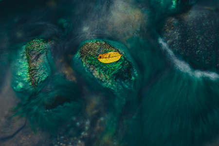 Detail of some leaves growing on a stone wall and a jet of water falling on it in the wild