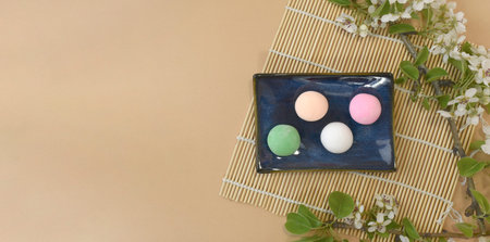Japanese traditional confectionery. Set of matcha mochi with blossom on bamboo mat on beige table. Healthy rice sweets. Ice cream. Spring flatlay for restaurant menu, receipt. Top view, copyspace