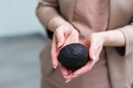 Woman hand holding avocado on white background, closeup