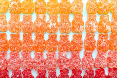 Rainbow juicy gummy candies background. top view. Jelly sweets.