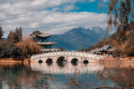 Beautiful view of the Jade Dragon Snow Mountain and the Suocui Bridge over the Black Dragon Pool in the Jade Spring Park, Lijiang, Yunnan province, China.