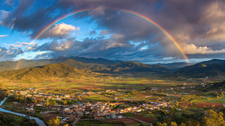 After rain, a rainbow forms over a countryside valley with fields and a small village under a wide open sky in the background.