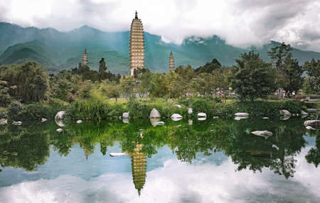A picturesque landscape displays a stone bridge and pagoda reflected in serene water. The composition showcases mountainous terrain and lush vegetation under an overcast sky. This image evokes tranquility, and could be utilized in travel, tourism, or environmental themes, providing visual appeal.