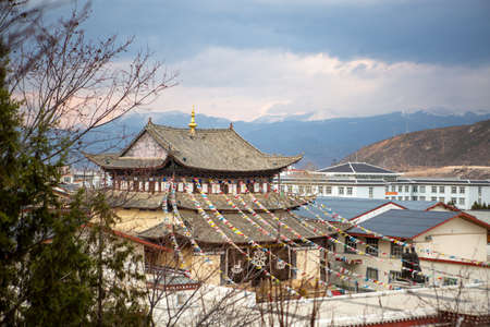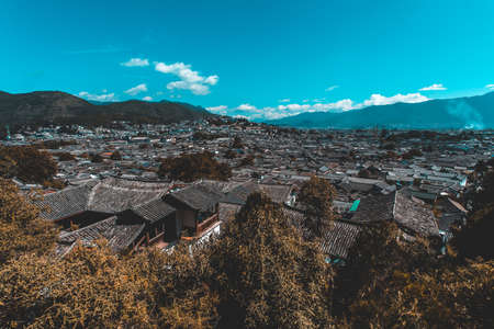 Lijiang, Yunnan Province, China - October 23, 2015: Awesome view of traditional Chinese black tile roofs of authentic houses in the Old Town of Lijiang. Scenic mountains are visible at sunset.