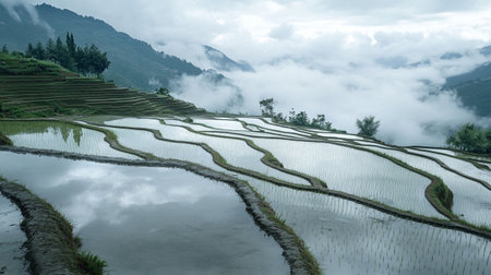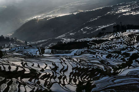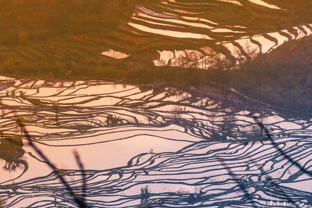 Rice terraces filled with water after rice harvesting on the sunrise in the mountains of Yunnan province, China. Aerial view of the rice field area, agricultural farms.