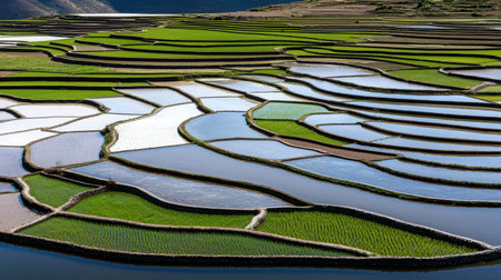 A breathtaking aerial view showcases intricate rice terraces reflecting shimmering water under golden sunlight, highlighting vibrant greens in a serene landscape.
