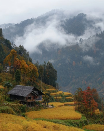 Golden rice grains are ready for harvest in a tranquil Asian village, surrounded by lush hills and misty mountains, capturing the beauty of autumn in rural life.