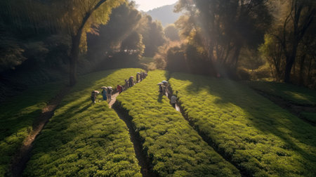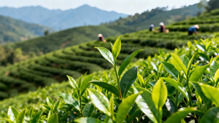 AI Generated. Freshly Harvested Green Tea Leaves Glistening in the Morning Dew Amidst a Serene Landscape