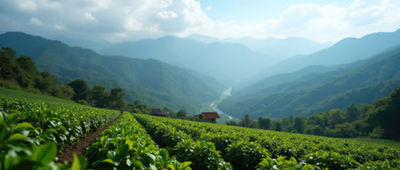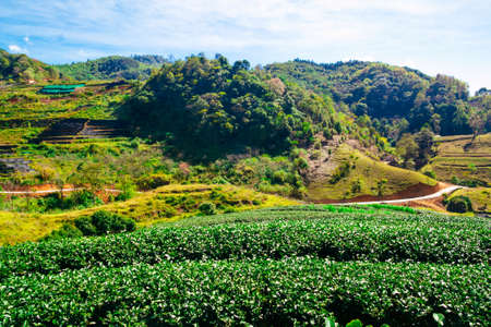Landscape view of tea plantation in the valley at Doi Angkhang, Chiangmai northern Thailand.
