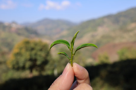tea leaves in hand on the background of the tea plantations.closeup tea bud or tea tips leaf blur mountain background no people