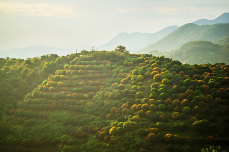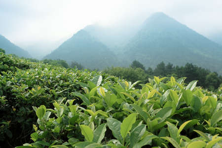 Landscape view of tea plantations in the morning mist in Taiwan.