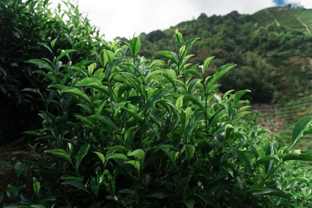 This image showcases a lush landscape featuring verdant foreground vegetation with bright green leaves. The background reveals a series of layered, misty mountain peaks. Soft lighting creates a serene atmosphere, suggesting an outdoor setting. Suitable for various uses, this image could enhance diverse commercial and editorial projects.