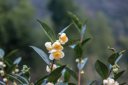 Under the sun, Tea flowers with white petals and yellow flower cores are in the wild tea forest