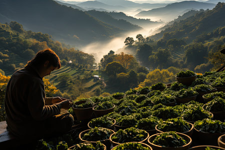 Coffee plantation in mountains with harvesting farmer., generative AI