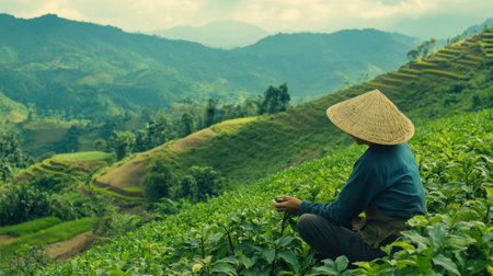 A farmer wearing a traditional hat plants rambutan saplings in a lush green field surrounded by mountains, highlighting sustainable agriculture and rural life.