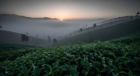 Verdant tea leaves glistening with dew drops at sunrise, with misty mountains in the background of the plantation