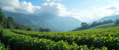 breathtaking landscape features rolling green tea and coffee plantations in the foreground, stretching across a lush valley framed by layers of misty mountains under a partly cloudy sky