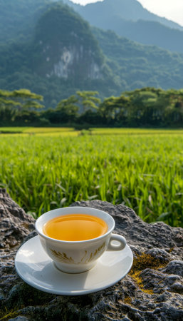 Green tea cup on mountain plantation background, great for text placement and design creativity