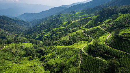 An aerial view of rolling hills adorned with vibrant green tea plantations under a clear blue sky at sunrise. The serene landscape showcases the beauty of nature.