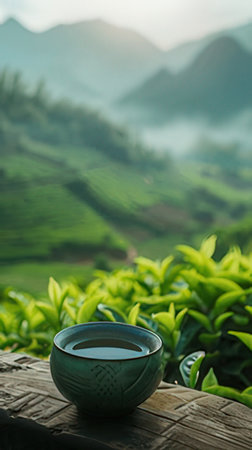 A delicate porcelain cup of green tea placed on a wooden table, overlooking vibrant tea plantations and mountains under a clear blue sky