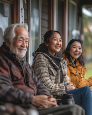 Friends and family share joyful moments on a porch, laughing and smiling under a soft afternoon light. The warmth of their connection creates a beautiful atmosphere during their relaxing time.