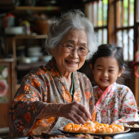 Asian grandmother teaching traditional cooking to grandchildren, family heritage, kitchen filled with laughter.