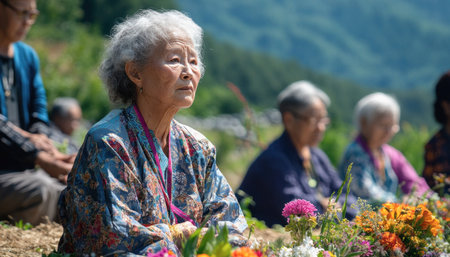 Senior asian woman sitting in community garden with flowers and other gardeners in background