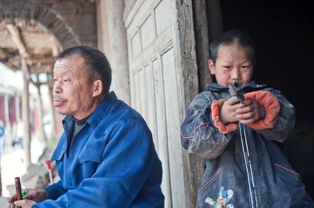 SICHUAN,CHINA-APRIL 4,2010:unknown old man and his grandson,April 4, 2010, sichuan province, China, the local old man help with child, and the child all parents work elsewhere