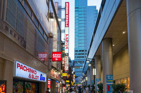 Tokyo, Japan - August 30, 2016: Street with advertisement of pachinko slot machines and shop in Shibuya district of Tokyo