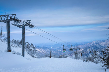 Cable car atop the snow-capped Deogyusan mountains at deogyusan national park near Muju, South Korea.