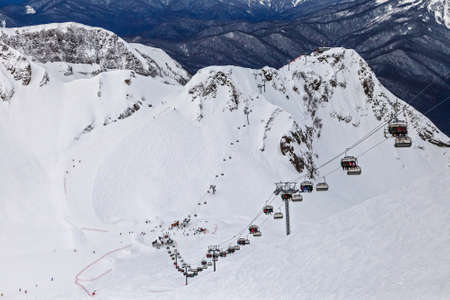 Skiers sits on the lift in ski resort Krasnaya Polyana, Sochi, Russia