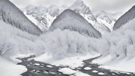 This stunning snow landscape showcases a picturesque winter scene featuring towering mountains, serene forests, and a pristine countryside blanketed in soft white snow, exuding peace,