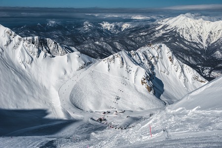 Winter mountain landscape: The Rosa Khutor Alpine Resort near Krasnaya Polyana panoramic background.