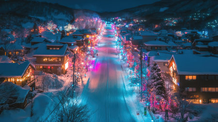 A stunning view of a snowy street illuminated by colorful lights at night, creating a magical winter atmosphere perfect for holiday celebrations.